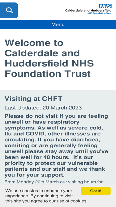 57%we employ around 6,000 staff who deliver compassionate care from our two main hospitals, calderdale royal hospital and huddersfield royal infirmary as well as in community sights, health centres and in patients’ homes. last year more than 123,300 men, women and children were cared for as inpatients (stayed at least one night) or day cases and more than 438,300 people attended our outpatient clinics. our a&e departments at both hospitals cared for more than 142,000 people. there were some 223,887 adult services and 64,108 children service contacts by our community teams.
