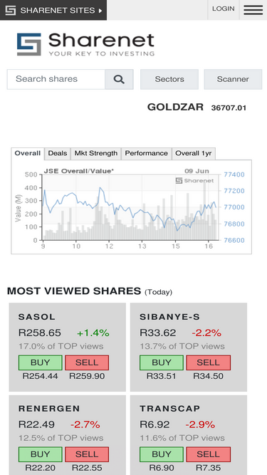88%Sharenet provides financial information and services for investors on The JSE Securities Exchange and other South African markets including online share trading, real-time streaming quotes, graphs, news, fundamentals, portfolios, watch lists, Unit Trusts and simulated stock market trading.