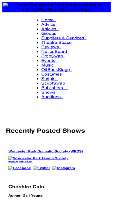 drama groups - amdram - amateur theatre, amateur dramatics theatre, amateur dramatics theatre uk based with worldwide, international connections - friendly site for amateur groups. good shows. good people. good fun. list your group and production / show / audition / event here. advertise your props, costumes, scenery, equipment, stage, theatre, theater music services - take advantage of our notice board and authors, playwrights and musicians promote your scripts and scores.
