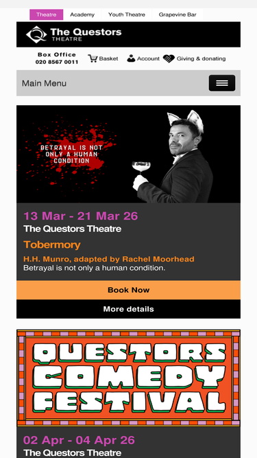 73%ealing's theatre. 350-seat playhouse and 90-seat studio. the questors stage 15-20 productions a year and host visiting companies. eight minutes from ealing broadway tube station. west london, w5.