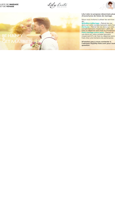 Créez votre liste de mariage personnalisée en 1 minute sur MilleMercisMariage. La liste de mariage cagnotte la moins chère du marché. Inscription gratuite.