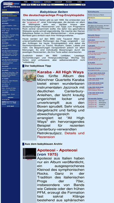 87%die babyblauen seiten sind die deutschsprachige progressive rock enzyklopädie der mailingliste progrock-dt: tausende rezensionen von prog-platten, alt wie neu, und viele weitere infos rund um progressive rock.