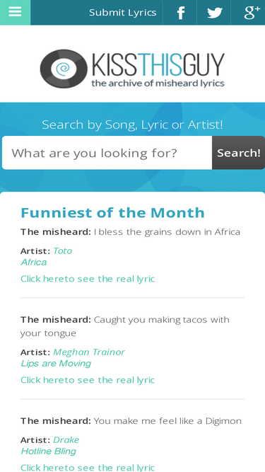 kissthisguy.com is a social website dedicated to misheard song and music lyrics.