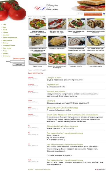 наш сайт вміщує рецепти найкращих страв світової і вітчизняної кухні. також ви знайдете безліч рецептів для повсякденного харчування, святкових і ексклюзивних страв. готувати їх нескладно, а ваші гості, безперечно, будуть приємно здивовані їх чудовим смаком.