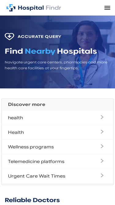 87%hospital findr offers a full range of health care facilities in the usa from hospitals, urgent care to pharmacies. unlock all nearby locations with details at your fingertips!