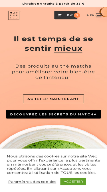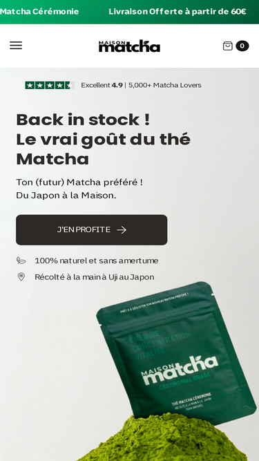 80%Découvrez le plaisir du meilleur du thé matcha chez Maison Matcha. Thé matcha bio cérémonie, accessoires traditionnels et recettes gourmandes : plongez dans l'univers du matcha et savourez ses bienfaits. Livraison offerte dès 60€ | Paiement sécurisé | Expédition sous 24h