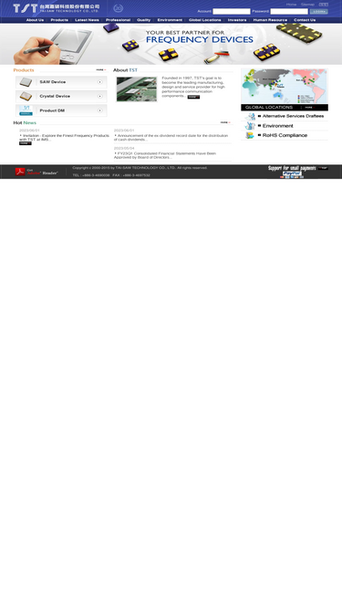 94%text/html; charset=utf-8 ; tst tai-saw technology major producer and developer of parts and modules used in saw and crystal, professional manufacturing company. tst is now recognized as the leading saw device supplier in taiwan, as well as the key oem/odm supplier of saw device in the world. while firmly committed to its core strength in the manufacturing and design of the saw devices, since early 2001 tst has expanded the span of its products and operations to cover saw devices and modules (xtal, xo, vco, vctcxo… etc).