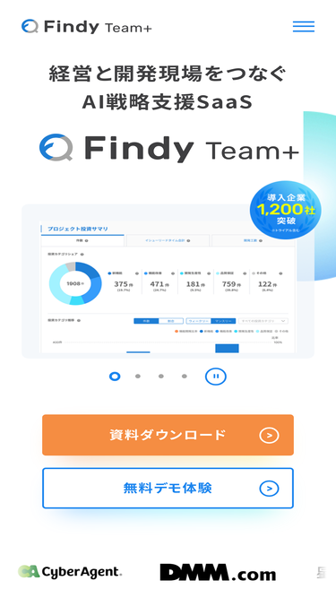100%Findy Team+は、1万を超える開発チームのデータを基に、Four Keysや開発生産性の可視化・向上を通じて、アジャイルな開発をサポートします。