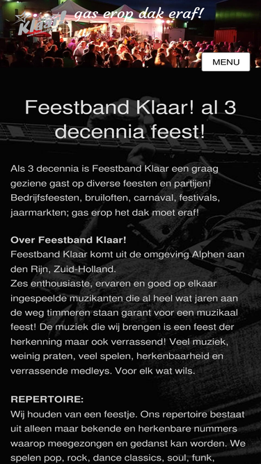 100%welkom op de website van feestband klaar! de feestband uit omgeving alphen a/d rijn. altijd klaar! om te spelen op uw bruiloft, bedrijfsfeest, carnavalsfeest of gewoon lekker in de kroeg!