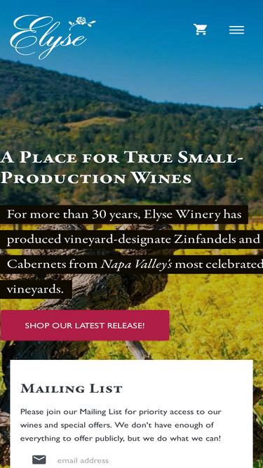 90%Elyse Winery produces vineyard-designate Zinfandel and Cabernet from Napa Valley's most celebrated vineyards.