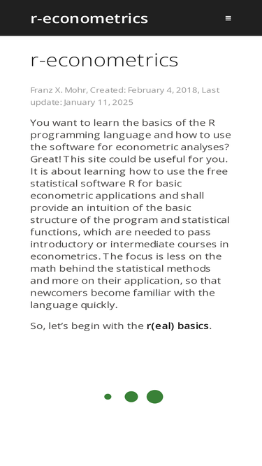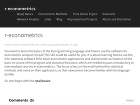 92%a site about learning how to use r for basic econometric applications. the focus is less on the math behind the statistical methods and more on their application, so that beginners become familiar with the language quickly.