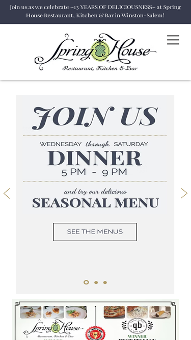 98%Welcome to Spring House in Winston-Salem! Our award-winning restaurant is located in the heart of downtown Winston-Salem in the historic A.H. Bahnson Home, which is on the National Register of Historical Places in North America.