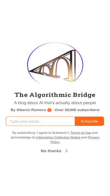 92%A blog about AI that's actually about people. Click to read The Algorithmic Bridge, by Alberto Romero, a Substack publication with tens of thousands of subscribers.