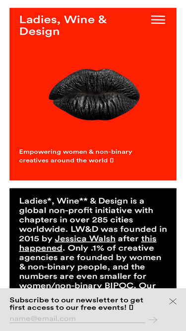65%Ladies, Wine Design was started by Jessica Walsh after writing this article as an initiative to foster women creativity. Only a tiny percent of creative directors are women, and LW&D wants to help change this through mentorship circles, portfolio reviews, and creative meet-ups.