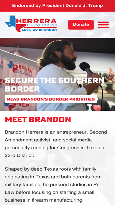 74%See rallies, town halls, fundraisers, canvassing, trainings, and watch parties for Brandon Herrera’s TX-23 campaign. Dates, locations, RSVPs, and recaps.