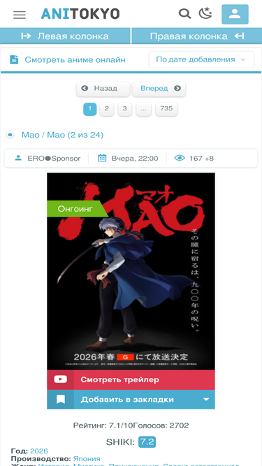 72%Наш аниме-проект включает в себя просмотр аниме онлайн, оригинальные саундтреки из фильмов и сериалов, новости и статьи о новинках в мире аниме!!! Всегда рады видеть Вас. Команда сайта AniTokio.tv