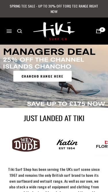 86%Established in ‘63, Tiki offers the UK’s largest Range of Surfboards, Wetsuits, Body Boards, SUPs & Surfing Accessories. Brands include Tiki, Torq, Softech, Mick Fanning, O'Neill, Ripcurl, Patagonia, Volcom and more.