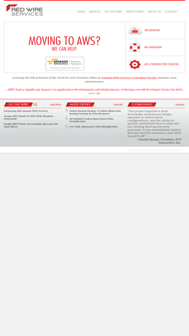 83%Please give us a call or contact us with the form below. Phone: (206) 829-8621 Fax: (206) 826-1223 Physical Address: Red Wire Services, LLC 15215 52nd Ave S, Suite 205 Seattle, WA 98188 Mailing Address: Red Wire Services, LLC PO Box 88401 Seattle, WA 98138-2401 Primary Server Operating System (OS)LinuxWindowsOther Privacy Policy
