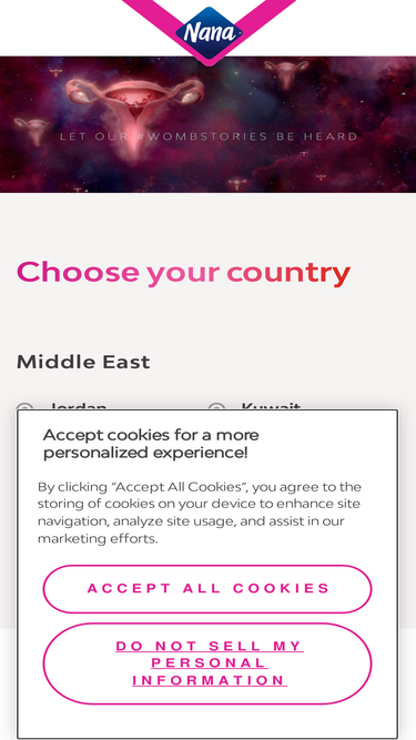 100%welcome to nana middle east. click here to choose your country and find information about our culture, products and feminine hygiene.