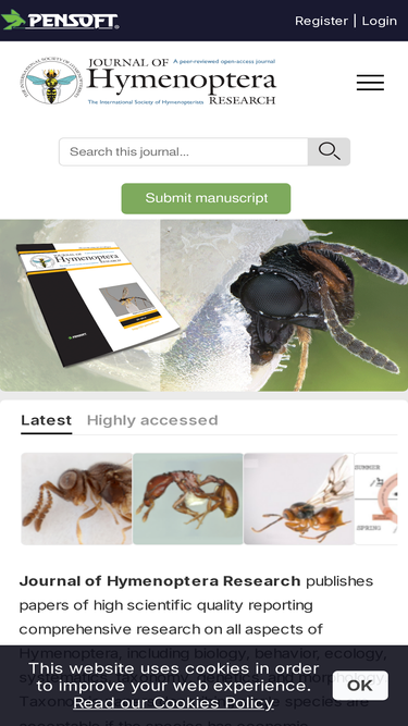 82%Journal of Hymenoptera Research publishes papers of high scientific quality reporting comprehensive research on all aspects of Hymenoptera, including biology, behavior, ecology, systematics, taxonomy, genetics, and morphology. Taxonomic papers describing single species are acceptable if the species has economic importance or provides new data on the biology or evolution of the genus or higher taxon. Manuscript length generally should not exceed 50 typed pages; however, no upper limit on length is set for papers of exceptional quality and importance, including taxonomic monographs at generic or higher level. The journal is published on behalf of the International Society of Hymenopterists (www.hymenopterists.org).