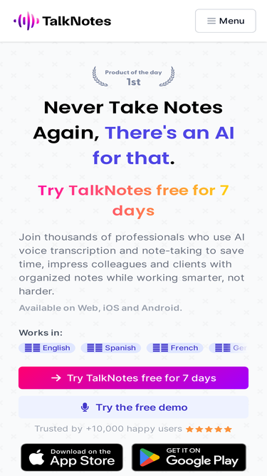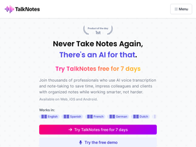 88%Turn hours of note taking into seconds. Record voice notes, and let the AI transcribe & structure them into actionable text. Create task lists, transcripts, blog posts, and more! Works in 50+ languages.