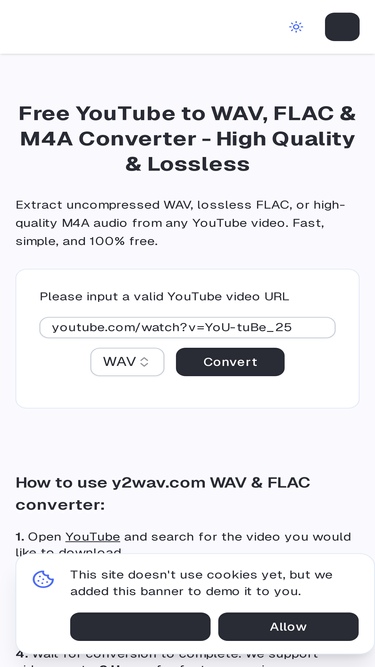 85%Convert YouTube videos to high-quality WAV or FLAC audio with y2wav.com. Fast, free, and ideal for creators, musicians, and archivists.