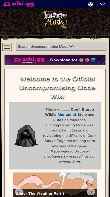 89%Welcome to the Official Uncompromising Mode Wiki This wiki uses Don't Starve Wiki's Manual of Style and Rules as reference. Uncompromising Mode was created with the goal of revitalizing the difficulty of Don't Starve Together for long-term veterans of the game. If you want to discover mechanics by yourself...
