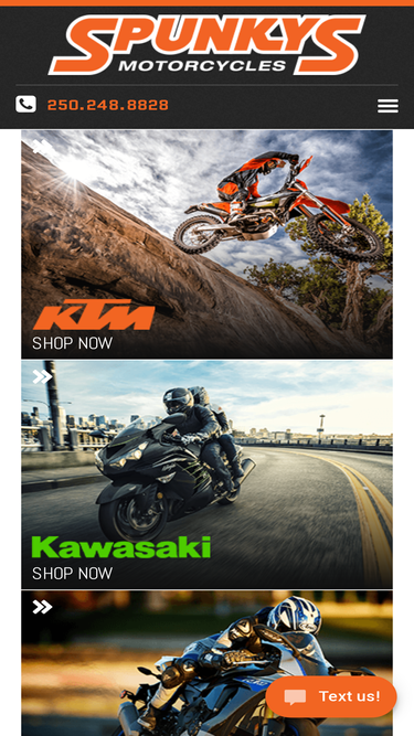 88%spunky's motorcycle shop is a new and used powersports dealership in parksville, bc, near nanaimo, duncan, victoria and courtenay. we feature motorcycles, power equipment, atvs, ktm, kawasaki, yamaha, parts, service, financing, and accessories.