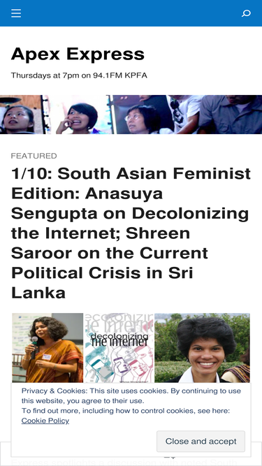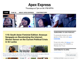 Thursdays 7 – 8 p.m. PST KPFA 94.1 FM, KPFB 89.3 FM in Berkeley; KFCF 88.1 FM in Fresno To listen online: kpfa.org Contact: apex@kpfa.org, 510-848-6767×464