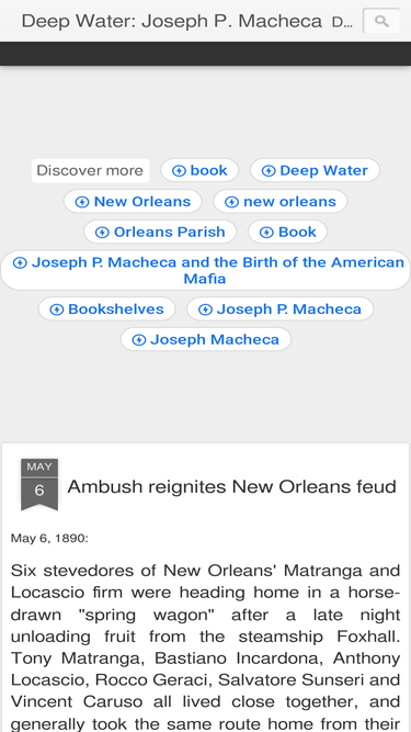 100%deep water is the historical biography of joseph p. macheca. in 19th century new orleans, macheca was a pioneer of commerce, a confederate privateer and, according to legend, the godfather of the first mafia organization to germinate in american soil.