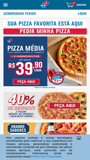 97%faça o seu pedido online na maior pizzaria do mundo! diversos tipos de pizzas, combos e promoções para você escolher. peça agora a sua domino's quentinha no nosso delivery online!