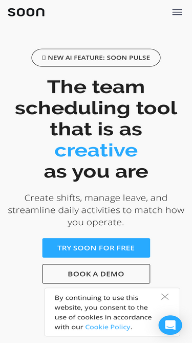 73%See how Soon streamlines shift planning, automates intraday tasks, and simplifies time-off tracking. Book your free 1:1 demo—no commitment needed.