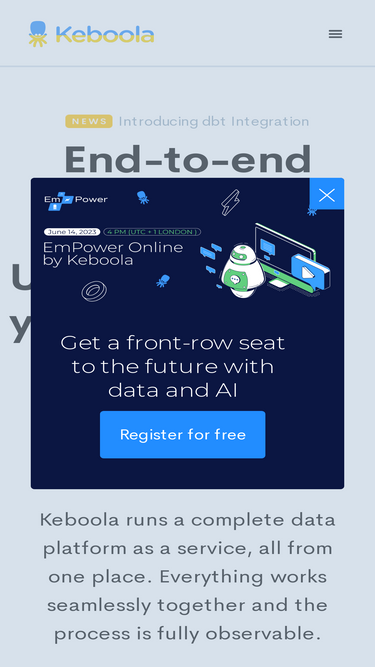 74%Transform your financial operations with Keboola's Financial Intelligence solution. Integrate and automate all your financial data for real-time insights, precise forecasting, and streamlined reporting. Enhance decision-making with AI-driven analytics and tailored data models. Boost efficiency and focus on strategic planning with Keboola's secure, comprehensive financial management platform.