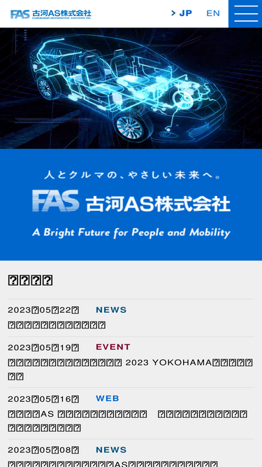 87%自動車用機能部品・ワイヤーハーネス・コネクタの開発・設計・製造に取り組む古河AS株式会社のホームページです。製品紹介をはじめとして、ものづくりや研究開発情報、CSR・環境活動、学生向けの採用情報などを掲載しています。