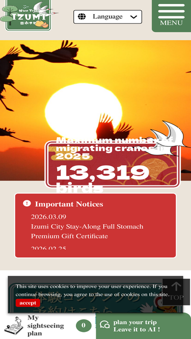 82%Izumi City, Kagoshima Prefecture, is the city with the most cranes in Japan, including ``Japan's No. 1 Crane Flying Area.'' Introducing the latest information on the number of cranes arriving and recommended ways to spend your time.