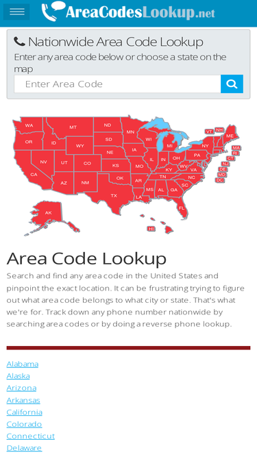 74%find all area codes in the nation with the area code lookup. areacodeslookup.net is designed to help you find an area code in a specific state or where the code originates.