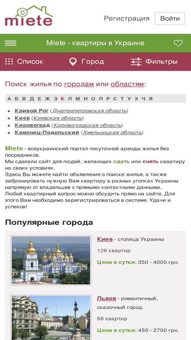 100%miete - аренда квартир посуточно в украине. здесь вы найдете квартиры посуточно в разных уголках украины с прямыми контактными данными их владельцев.
