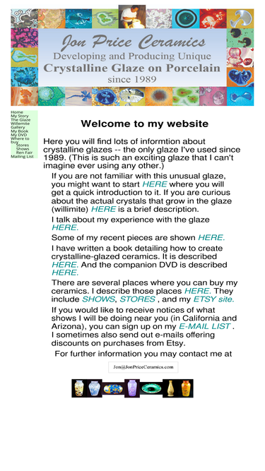 100%crystalline glazed porcelain vases, ornaments, and jewelry. includes description of technique, pictures of crystals, and items for sale.