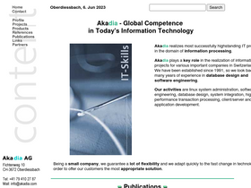 89%welcome at akadia, (akadia ag, information technology, fichtenweg 10, ch-3672 oberdiessbach, switzerland, oracle database competence centre) your expert for oracle database administration, tuning, design, java applications, perl programming. akadia occupies a leading function in many key projects. akadia have many years experiance with unix, nt and networking. akadia runs its own web server based on apache and linux. ask akadia !