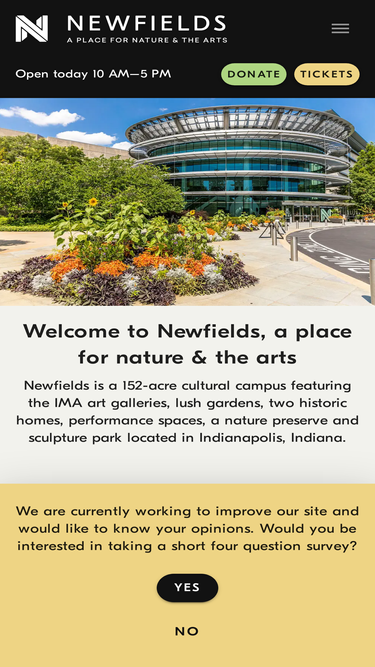 34%Newfields is a 152-acre cultural campus featuring the IMA art galleries, lush gardens, two historic homes, performance spaces, a nature preserve and sculpture park located in Indianapolis, Indiana.