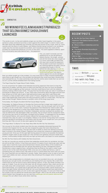 100%The words no win, no fee and celebrity singer are not often heard together in the same sentence unless someone launches a claim against the celeb singer in a bid to make cash. We often think that celebrities are immortal, … Continue reading →