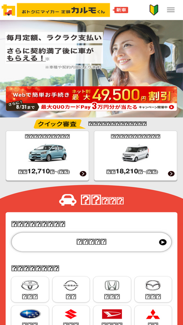 82%カーリースカルモくんの納車までの流れ詳細ページです。【ネット割最大49,500円】頭金・ボーナス払い0円で新車に格安で乗れる。毎月定額、税金コミコミで安心です。メンテナンスも月額定額にできるプランや、契約満了後に車がもらえるオプションもご用意。