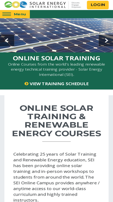 82%solar energy international's (sei) online campus has been offering online courses in solar pv, renewable energy, and sustainable building technologies for over 10 years. through our outreach programs, sei works with grassroots and development organizations to promote sustainability and improve quality of life around the world. interested in online solar training and renewable energy courses? check out our courses here.