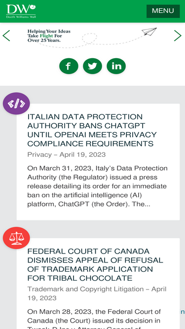 55%As someone on the forefront of Information Technology, you require a law firm that knows the territory and knows how to get things done quickly and effectively. That means more experience. More agility. More responsiveness. No bureaucracy. No knowledge gaps. No legal memos. In short, you require the specialists in this sector: Deeth Williams Wall. We have more depth of experience and dedicated resources in this field than most of Canada’s largest law firms.