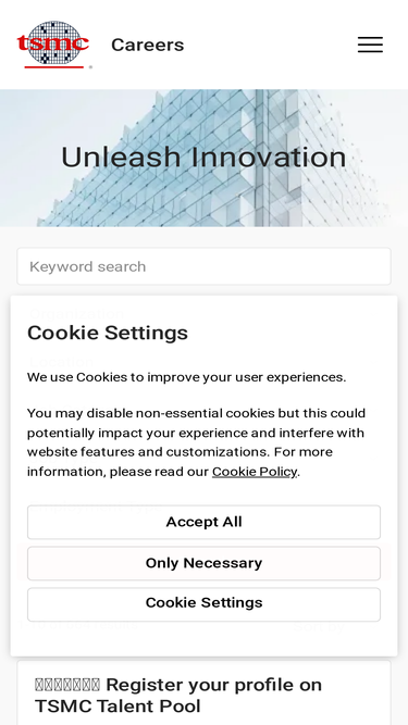 100%careers home · jobs · tsmc careers ·> careers > jobs at tsmc. first time applicant. sign in · search jobs · my profile