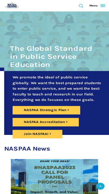 75%we promote the ideal of public service globally. we want the best prepared students to enter public service, and we want the best faculty to teach and research in our field. everything we do focuses on these goals. naspaa's home page. we promote the ideal of public service globally. we want the best prepared students to enter public service, and we want the best faculty to teach and research in our field. everything we do focuses on these goals.