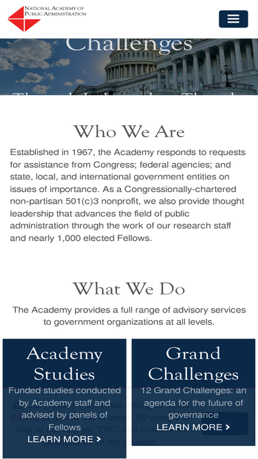 The National Academy of Public Administration helps government leaders solve their most critical management challenges. Since 1967, our congressionally chartered non-partisan non-profit Academy has provided expert advice to government leaders in building and managing more effective, efficient, equitable, accountable, and transparent organizations.