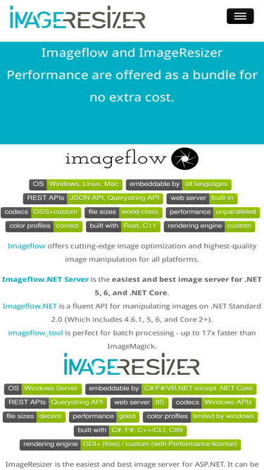 93%imageresizer and imageflow optimize and modify your app's images on-the-fly for phenomenal web performance and quick responsive development. drop-in compatible with your existing apps and cms - or deployable as a microservice. improve your sales by reducing page load time.