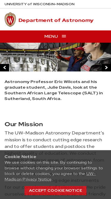 100%Our Mission The UW-Madison Astronomy Department’s mission is to conduct cutting edge research and to offer students and postdocs the highest quality of education. We conduct research in diverse areas of astronomy, from the physics of stars to cosmology, in observation and theory, and through the construction of cutting edge instruments for our complement of…