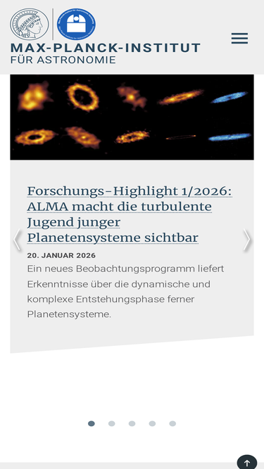 100%Wie entstehen Sterne und Planeten? Welche Eigenschaften haben Planeten, die andere Sterne umkreisen als die Sonne? Beherbergt irgendein anderer Planet Leben? Wie entstehen die Galaxien, und wie haben sich ihre Eigenschaften über die kosmische Geschichte hinweg verändert? Mit diesen Fragen beschäftigen sich die Wissenschaftler und Ingenieure am Max-Planck-Institut für Astronomie (MPIA) in Heidelberg. Das MPIA wurde 1967 gegründet und ist eines von rund 80 Instituten der Max-Planck-Gesellschaft, Deutschlands größter Organisation für Grundlagenforschung. Das MPIA hat rund 290 Mitarbeiter. Drei Viertel davon sind im wissenschaftlich-technischen Bereich beschäftigt. Zu jeder Zeit sind am Institut zahlreiche Nachwuchs- und Gastwissenschaftler aus dem In- und Ausland tätig.